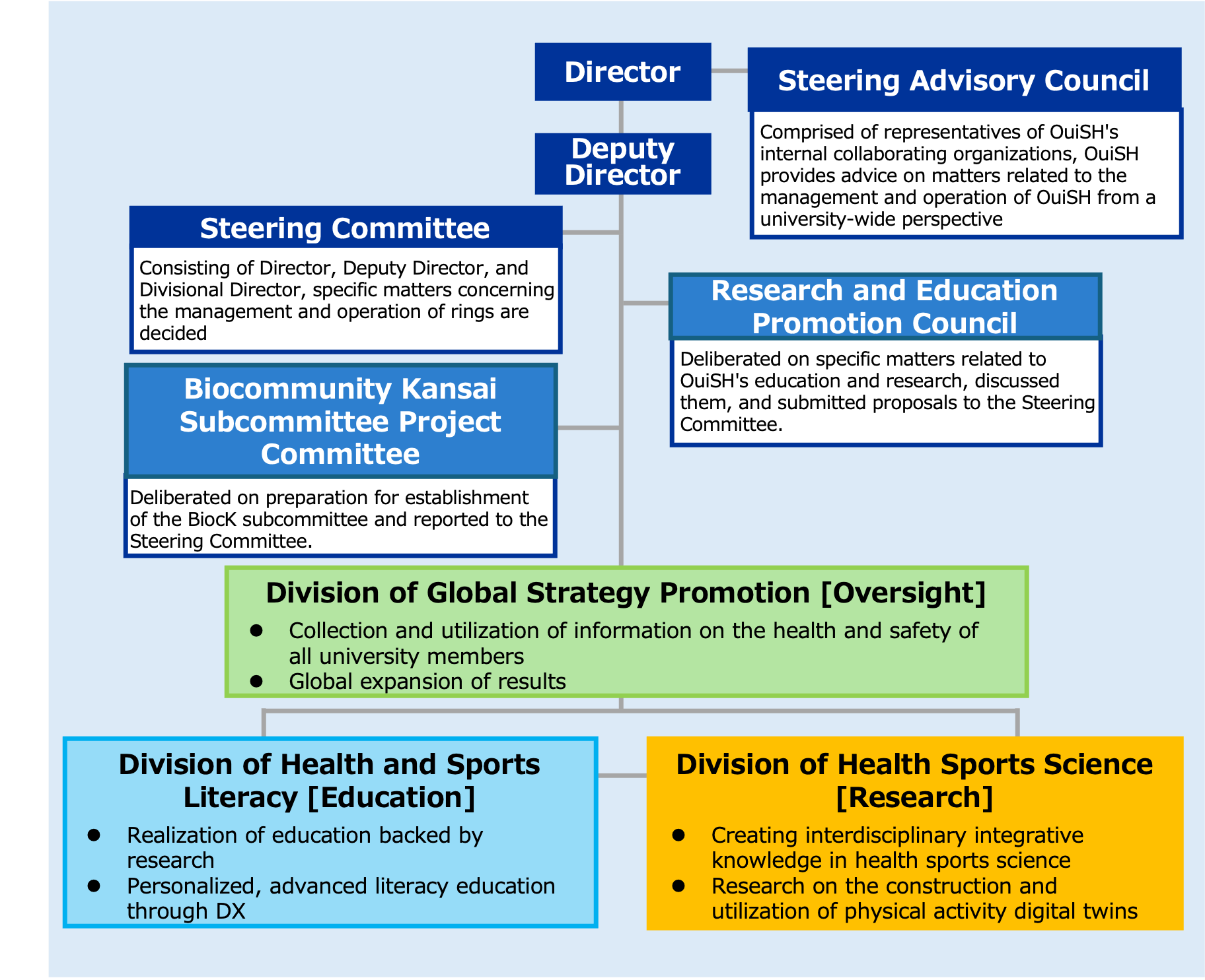Three divisions have been established at the Osaka University Institute for Sports and Global Health (OuiSH). The “Division of Global Strategy Promotion [General Affairs]” aggregates and utilizes information related to the health and safety of all university members and globally disseminates the results. The “Division of Health Sports Literacy [Education]” aims to realize education backed by research, providing personalized advanced literacy education through digital transformation (DX). The “Health Sports Science Division [Research]” creates interdisciplinary integrated knowledge of health sports science and promotes the project “Construction of Health-Physical Activity Digital Twin.